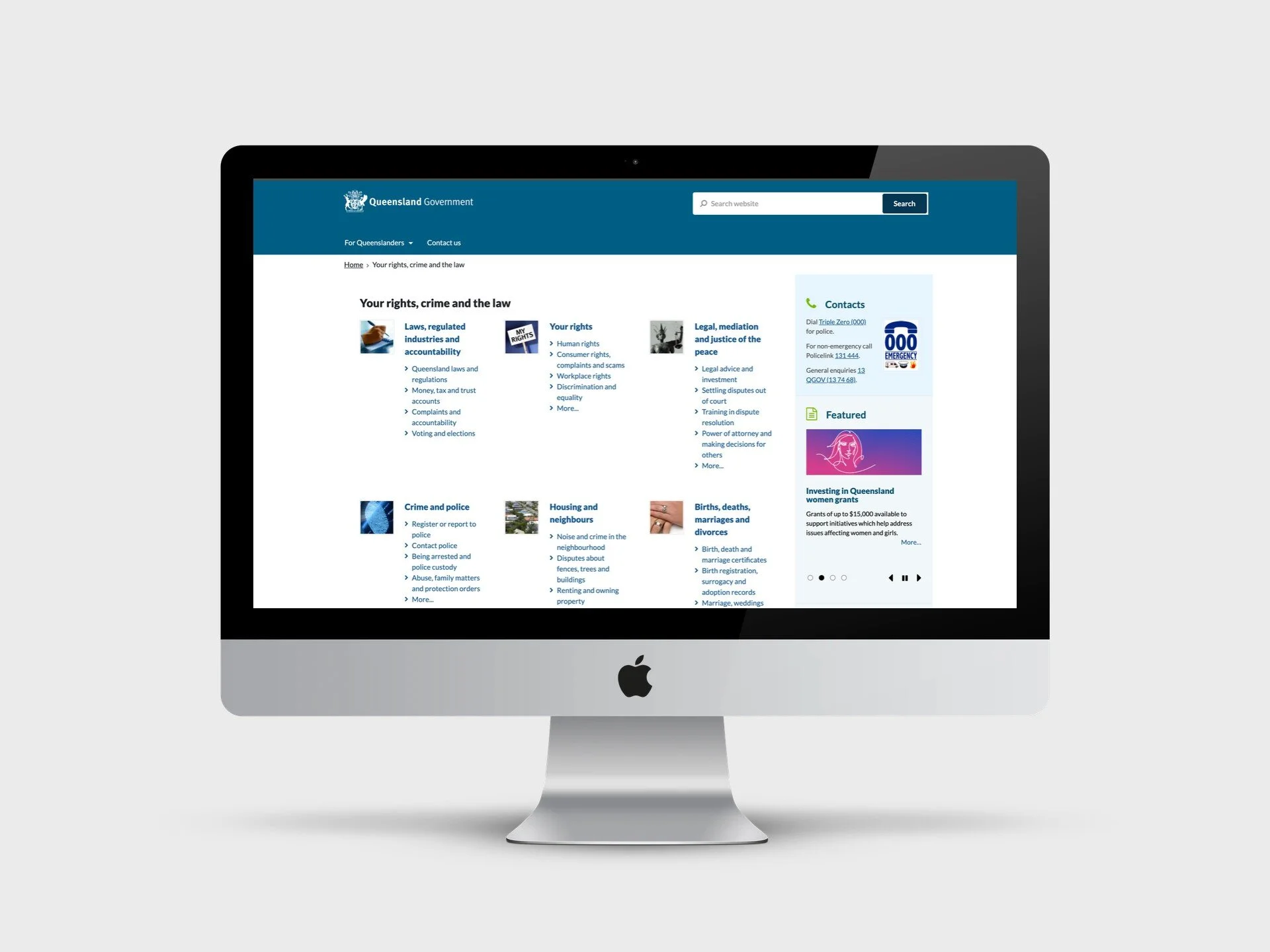 The result was a customer tested topic based digital product which is delivered through a decentralised publishing model using Squiz and indexed to TeamSite. Following customer principles of simple to use, easy to find, personalised and guided the website delivered content for over 5 different Queensland Government agencies including Births, deaths and marriages, Justice of the Peace, Corrections, Police and Fair Trading.